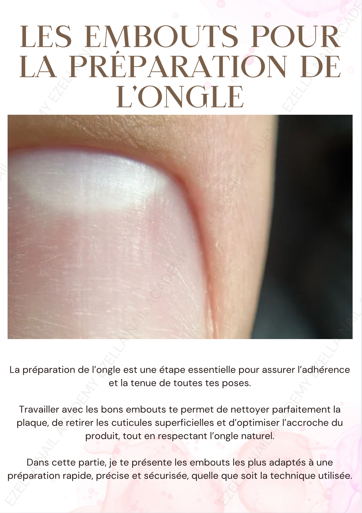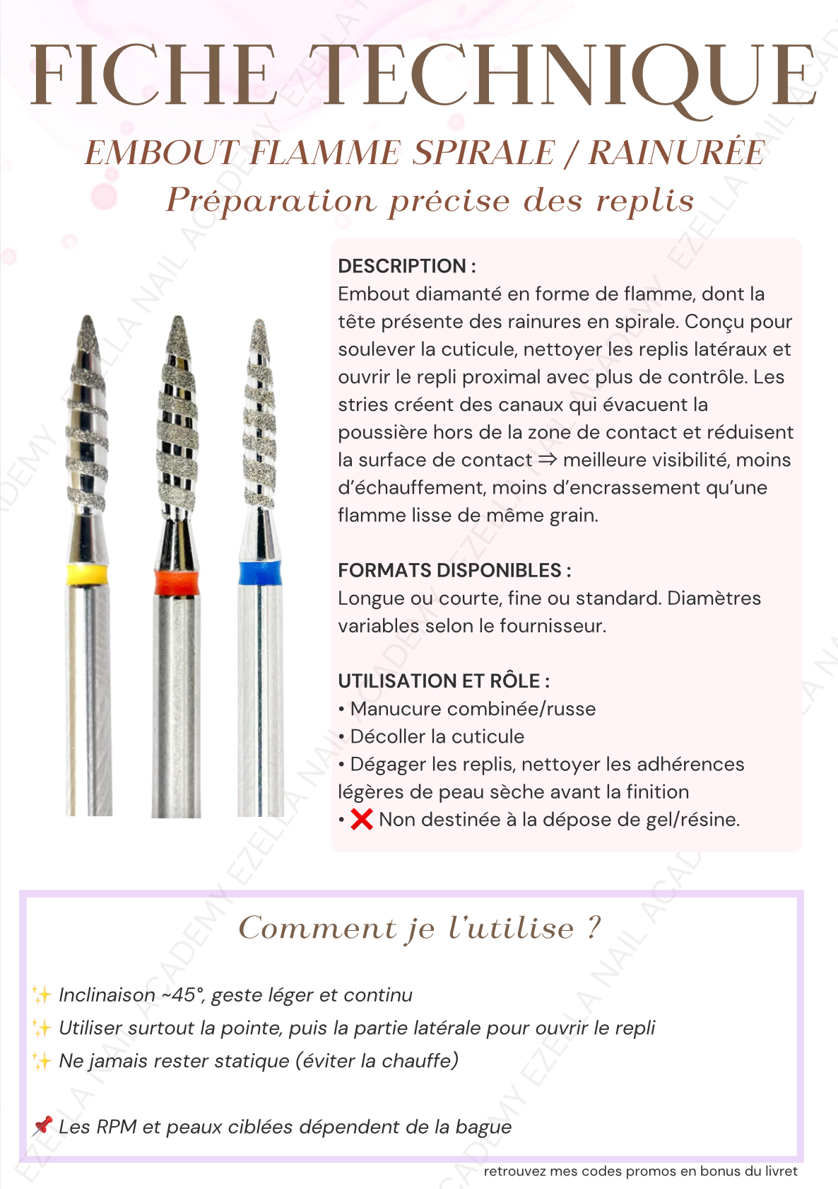 Un guide clair et concret pour utiliser tes embouts de manucure sans abîmer la plaque. Chaque embout est présenté de maniere technique : utilité, moment d’utilisation, inclinaison, RPM indicatifs, type de peau, zone active.